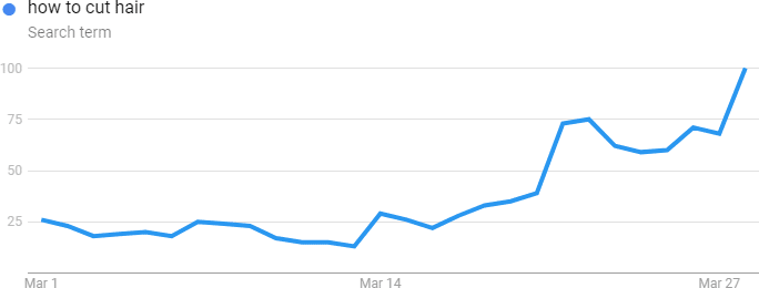One final tip — everything discussed in this post can also be used to explore a traffic increase. Even during COVID-19, traffic has gone up for many topics and sites. For example, here's the Google Trends data for "how to cut hair" from the same March 1-28 time period ...