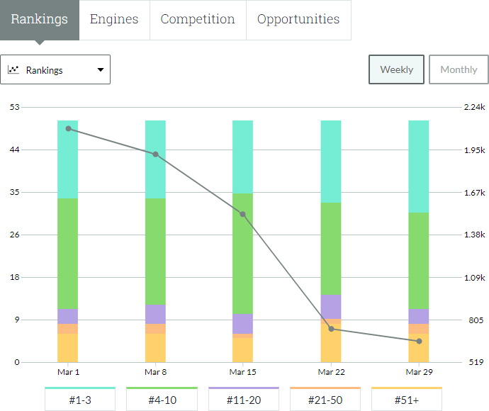For a richer view, go back to the "Rankings" tab and select "Rankings" (instead of "Search Visibility") from the drop-down. You'll see a graph that looks something like this ...