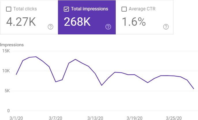 CTR has also dropped, even a bit steeper than impressions. This is a bit harder to interpret. Knowing what we know, it's likely that people are clicking less because of overall lack of interest. This is consistent with the COVID-19 scenario. People are less likely to be looking for the service this site offers. On the other hand, it could be that something about the site or the competitive landscape has changed that's driving down CTR.