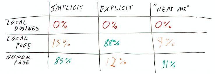 Again, this doesn't have to be super precise. We're looking to get a proportionate directional indication of what would be useful here. I've got Implicit, Explicit, and Near Me keyword groups. I've got Local Business, Local Page, and National Page result types. Then I'm just figuring out what the visibility share of all these types is. In my particular example, it turns out that for explicit terms, it could be worth building some local pages.