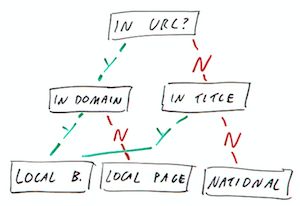 I've drawn up a little flowchart here that you could encapsulate in a Excel formula or something like that. If the location is mentioned in the URL and in the domain, then we know we've got a local business. Most of the time it's just a rule of thumb. If the location is mentioned in the URL but not mentioned in the domain, then we know we've got a local page and so on.