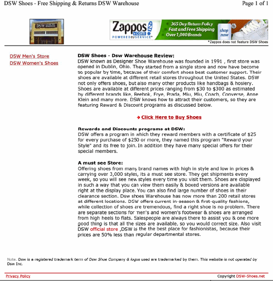 The affiliate who created dswshoes.net probably crossed the line between helpful information for the consumer and confusing the consumer. If the affiliate didn't use DSW's stock photography, used a different domain (such as shoestorereviews.com), had been more clear about his lack of relationship with DSW and more clear about his relationship with Zappos.com, he would probably have been okay. Unfortunately, the site does tend to create the impression that it has a formal relationship with DSW and that you can click to purchase DSW shoes. Check out this screen shot of one of the offending sites: