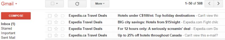 - Body of Email 2: Blah, blah, blah, Get 15% off vacation packages!