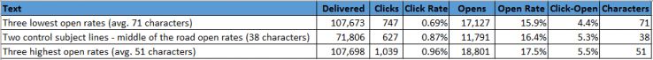 Does this mean 51 characters is the ideal, maximum subject line length? Not necessarily. Too short can be an issue as well, as too few characters means fewer words at your disposal to entice an open and convey meaning. The three best performing subject lines in this test (average of 17.5% opened) averaged 51 characters long; the three with the lowest open rates (average of 15.9% opened) averaged 71 characters long. The two control group subject lines (average of 16.4% opened), at our shortest 38 characters, landed squarely in the middle in terms of open rate.