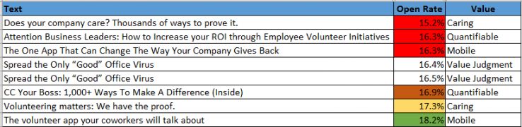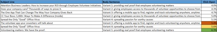 Our highest open rate subject line (18.2%), " The volunteer app your coworkers will talk about" did not win in terms of either overall clicks (0.98%) or click-to-open rate (5.4%). This tells me two things: