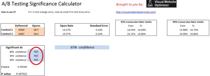 For this test, I've mentioned several times that two control emails were used. These both went to approximately the same number of people (36,000), and had identical subject lines and identical body copy. These two segments had similar, but not identical, overall open rates of 16.4% and 16.5%. In order to make sure that overall results are valid and there is no unintentional selection skew when creating (what should be random) segments, it's imperative to make sure that the variation between these two control segments is nothing other than random noise.