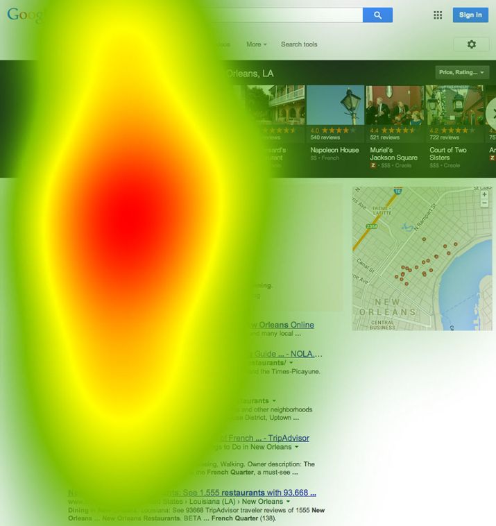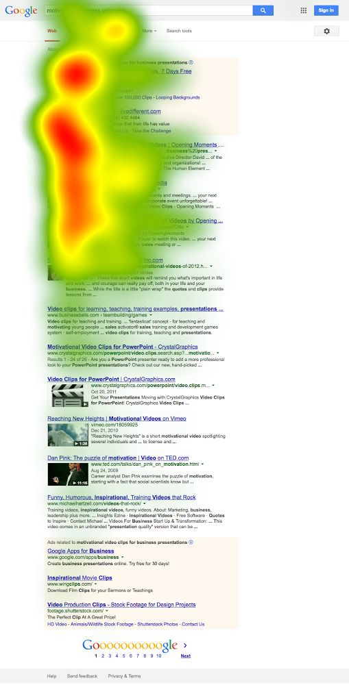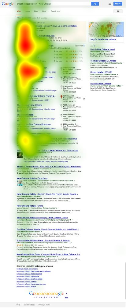 There are going to be situations when a business can't get to number one on the organic listings. As previously mentioned, the study shows that this is still the key place to be, and the top organic listing captures more clicks that any other single listing. But if your chances of getting to that number one spot are slim, you need to focus on other areas of the SERP, such as positions #4 or higher, which will be easier to obtain ranking for—businesses that are positioned lower on the SERP (especially positions 2-4) see more click activity than they did several years ago, making this real estate much more valuable. As Gord Hotchkiss writes about, searchers tend to "chunk" information on the SERP and scan each chuck in the same way they used to search the entire SERP—in a triangle pattern. Getting listed at the top of a "chunk" can therefore be effective for many businesses. This idea of "chunking" and scanning can be seen in the heat map below.
