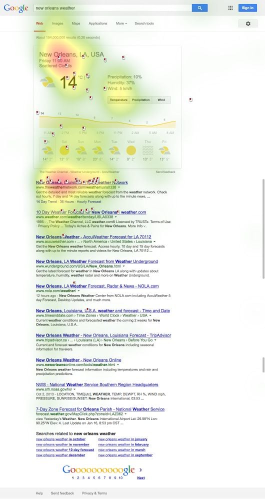 An example is in the case of the knowledge graph. In Mediative's study. when searchers were looking for "weather in New Orleans", the results page that was presented to them showed exactly what they needed to know. Participants were asked to click on the result that they felt best met their needs, even if, if reality, they wouldn't have clicked through (in order to end that task). When a knowledge graph result exactly met the intent of the searcher, the study found 80% of people looked at that result, and 44% clicked on it. Google provided searchers with a relevant enough answer to keep them on the SERP. The top organic listing captured 36.5% of pages clicks—compared to 82% when the knowledge graph did not provide the searcher with the answer they were looking for.