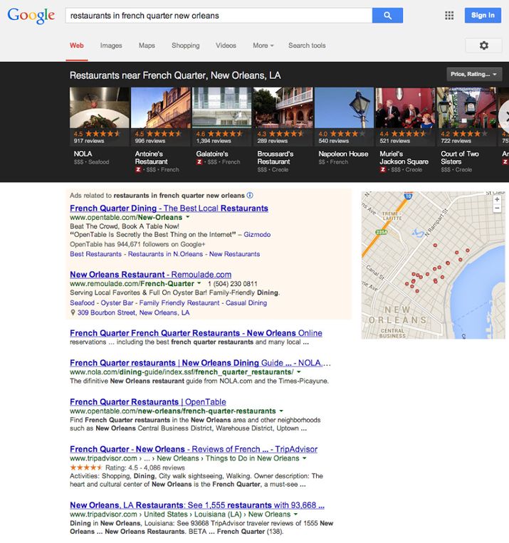 Mediative's research also found that there are branding effects of paid search, even if not directly driving traffic. We asked participants to "Imagine you are traveling to New Orleans and are looking for somewhere to meet a friend for dinner in the French Quarter area. Use Google to find a restaurant." Participants were presented with a SERP showing 2 paid ads—the first was for opentable.com, and the second for the restaurant Remoulade, remoulade.com.