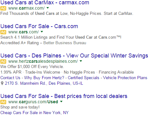 The 4-ad blocks look the same as other, recent top ad blocks, with the exception of the fourth listing. Here’s one for “used cars,” localized to the Chicago area: