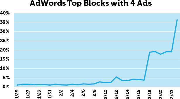 On the morning of February 18, the percentage of top ads blocks displaying 4 ads jumped to 18.9%. As of this morning (February 23), that percentage has jumped again, to 36.4%. Of the 5,980 page-1 SERPs in our tracking data that displayed top ads this morning, here’s how the ad count currently breaks down: