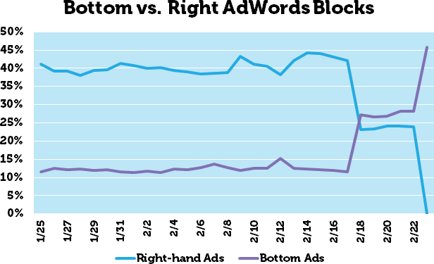 In line with Google's public statements this week, we’ve seen another shift — right-hand column ads started shifting to the bottom-left position and then disappeared completely as of this morning (February 23). This is a 30-day graph for the occurrence of right-hand ads and bottom ads in our data set: