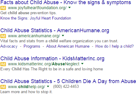 Please note that our data set tends toward commercial queries, so it’s likely that our percentages of occurrence are higher than the total population of searches. Public statements from Google are suggesting that 4-ad blocks are only occurring on highly commercial searches, but we're seeing some exceptions (here's one for "child abuse"):