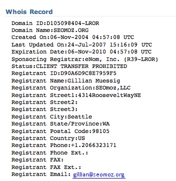 If you looked up SEOmoz.org on Whois.domaintools.com, here is what you would see after scrolling just below the fold of the page: