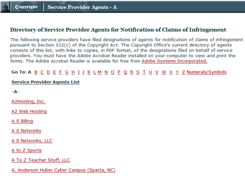However, it won't always be so easy. Let's assume for a minute that you couldn't find contact information for HopOne on its site. The DMCA has statutory incentives to encourage OSPs to register with the U.S. Copyright office. Thus, to locate the contact information for your OSP, go to the U.S. Copyright office list of designated agents for OSPs. Look on that list under the letter "H" for Hop One.