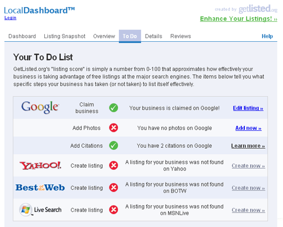 Keeping with SEOmoz, our listing snapshot revealed that we have claimed a listing in Google but not in any of the other locations.
