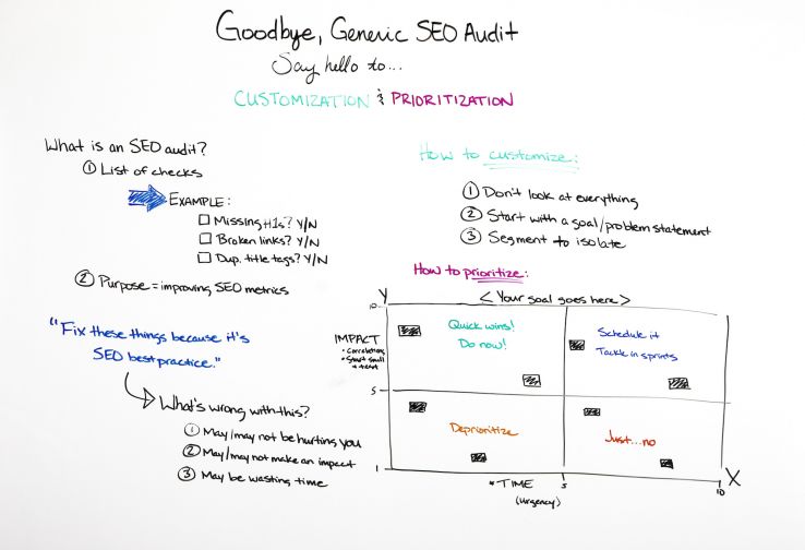 With 100s of Google ranking factors, it's easy to get overwhelmed when working to perform a technical SEO audit. If it doesn't meet best practices it ought to be fixed, right? Not always. Though an SEO audit is essentially a checklist, it's important to both customize your approach and prioritize your fixes to be efficient and effective with your time and effort. In today's Whiteboard Friday, Kameron Jenkins teaches us her methods for saying adios to generic, less effective SEO audits and howdy to a better way of improving your site.