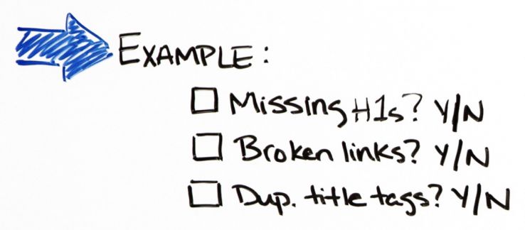So you have things like: Missing H1s, yes or no? Broken links, yes or no? Duplicate title tags, yes or no? So you end up with this whole big, long list of things that are wrong and not according to SEO best practices on your site.