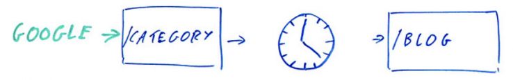If you leave for half an hour, then again you've got two sessions. One, the category page is the landing page and the source of Google, and one in this case where the blog is the landing page, and this would be another self-referral, because when you come back after your coffee break, you're going to click through from here to here. This time period, the 30 minutes, that is actually adjustable in your settings, but most people do just leave it as it is, and there isn't really an obvious number that would make this always correct either. It's kind of, like I said earlier, an arbitrary distinction.