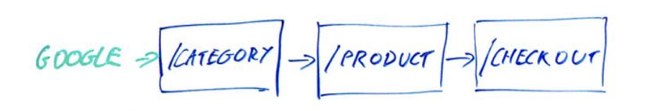So what they've tried to do is in the very basic case something quite similar: arrive by Google, category page, product page, checkout. Great. We've got one long session, and the source is Google. Okay, so what are the different ways that that might go wrong or that that might get divided up?