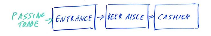 So in this example, say a supermarket, we enter by a passing trade. That's going to be our source. Then we've got an entrance is in the lobby of the supermarket when we walk in. We got passed from there to the beer aisle to the cashier, or at least I do. So that's one big, long session with the source passing trade. That makes sense.