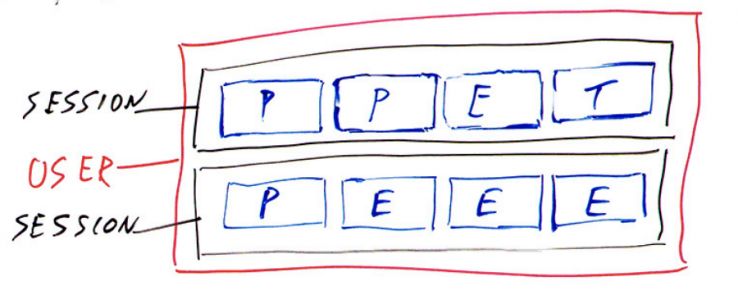 The job of Google Analytics is to take all this hit data that you're sending it and try and bring it together into something that actually makes sense as sessions. So they're grouped into sessions that I've put in black, and then if you have multiple sessions from the same browser, then that would be a user that I've marked in pink. The issue here is it's kind of arbitrary how you divide these up.