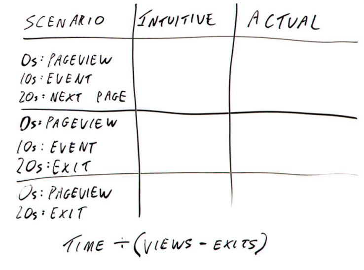 They've got no further data to work with. So what they do is they say, "Okay, we're not going to include that in our average time on page metrics." So we've got the formula of time divided by views minus exits. However, this fudge has some really unfortunate consequences. So let's talk through these scenarios.