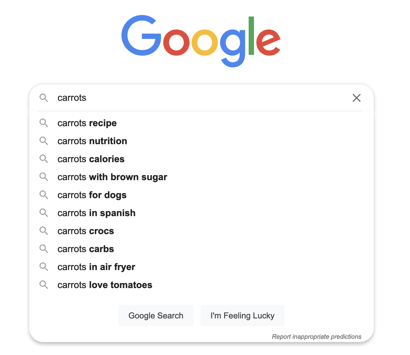 Google Autocomplete is perfect for discovering more specific and relevant phrases that searchers are using to solve problems or answer questions, as it extends your search query as you type it. If your query is searched a lot, Google will continue extending it further and further — just keep hitting space at the end of each query: