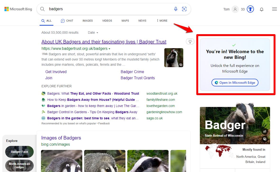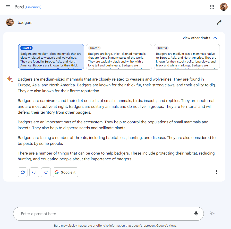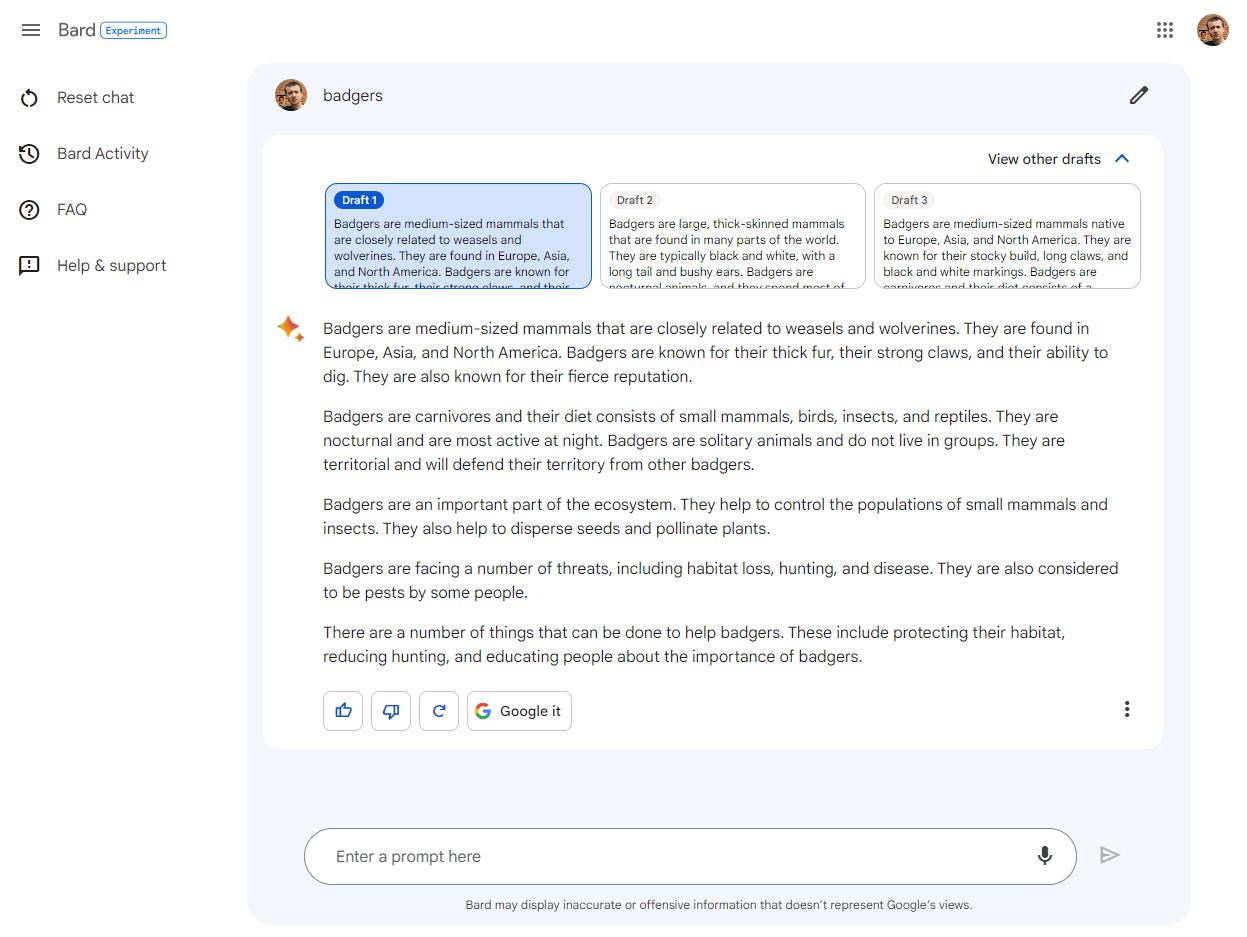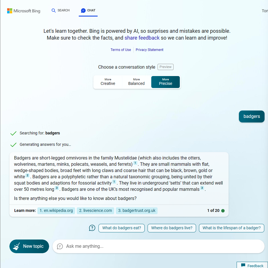 Now, it probably should be noted that chatbots are not really designed for me to just enter a one word keyword like “badgers”, like I might do in organic search. But, like Bing’s chat tab, I get something resembling an informational result. So, let’s compare side by side.