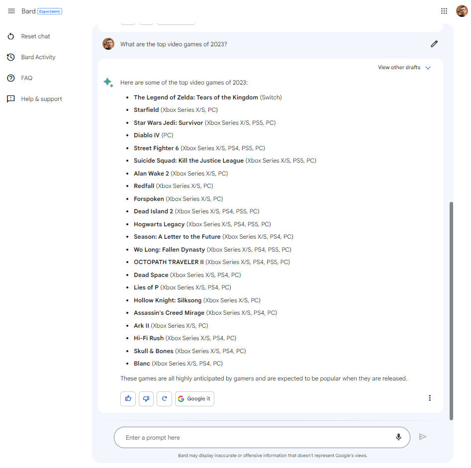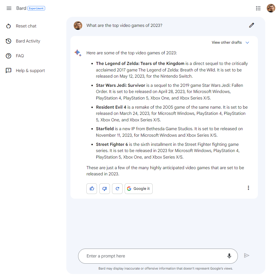 That said, I like that the framing of Google’s solution — with multiple draft answers presented and “enter a prompt here” — which makes it clearer I’m dealing with something that is not a source of unassailable truth.
