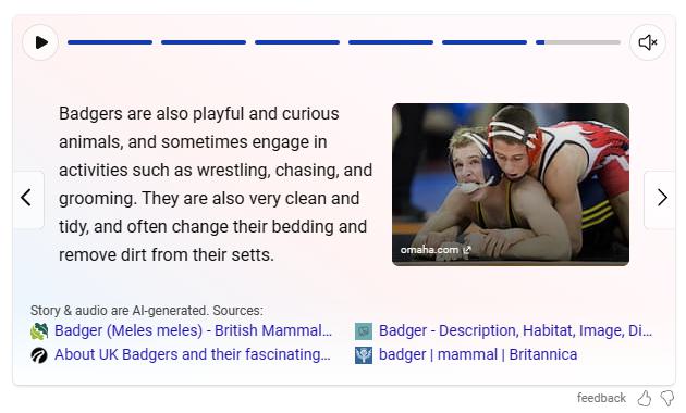 The “mustelid masters” box above the organic results is new, and contains AI-generated text with a voice-to-speech capability. It’s a six-part story, with sometimes surprising accompanying imagery: