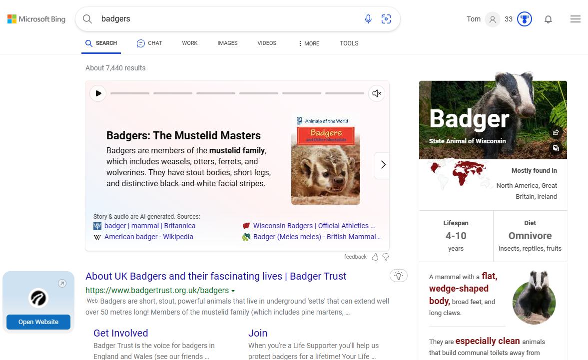 Lastly, one of the tabs in the story cites the Wisconsin Badgers, and a page which is entirely unrelated to the content at hand, so perhaps Bing is also citing its sources for disambiguation here?