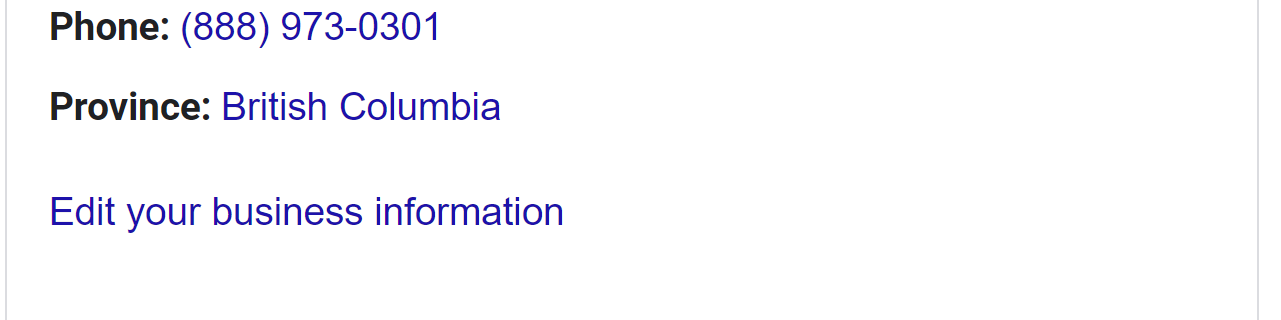 In our example, Google is providing additional location information. Some listings will have a province or county listed in this area. Others will have a different special feature called “located in” that can appear when a business or department is contained within another entity, like the parts department inside an automotive dealership: