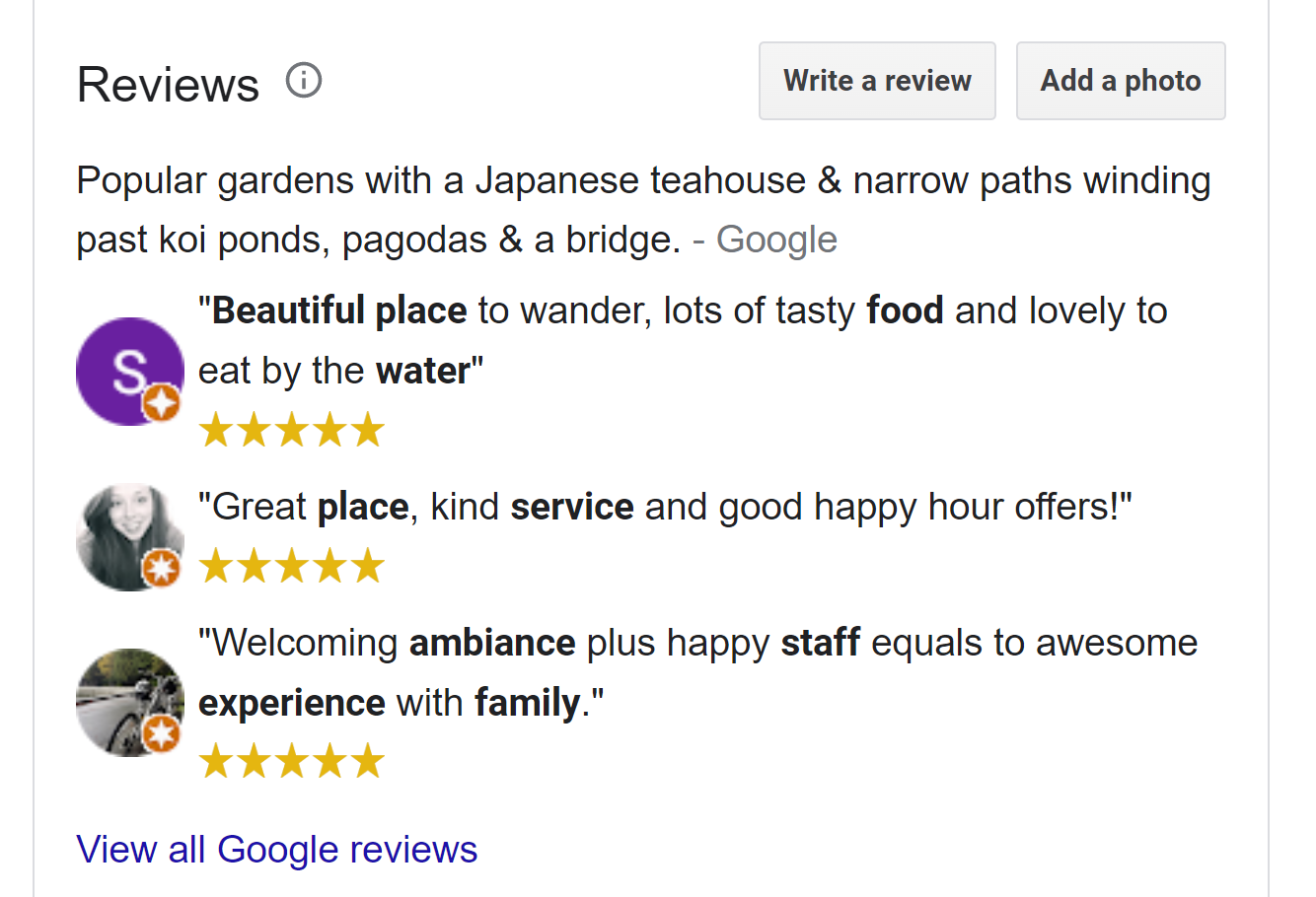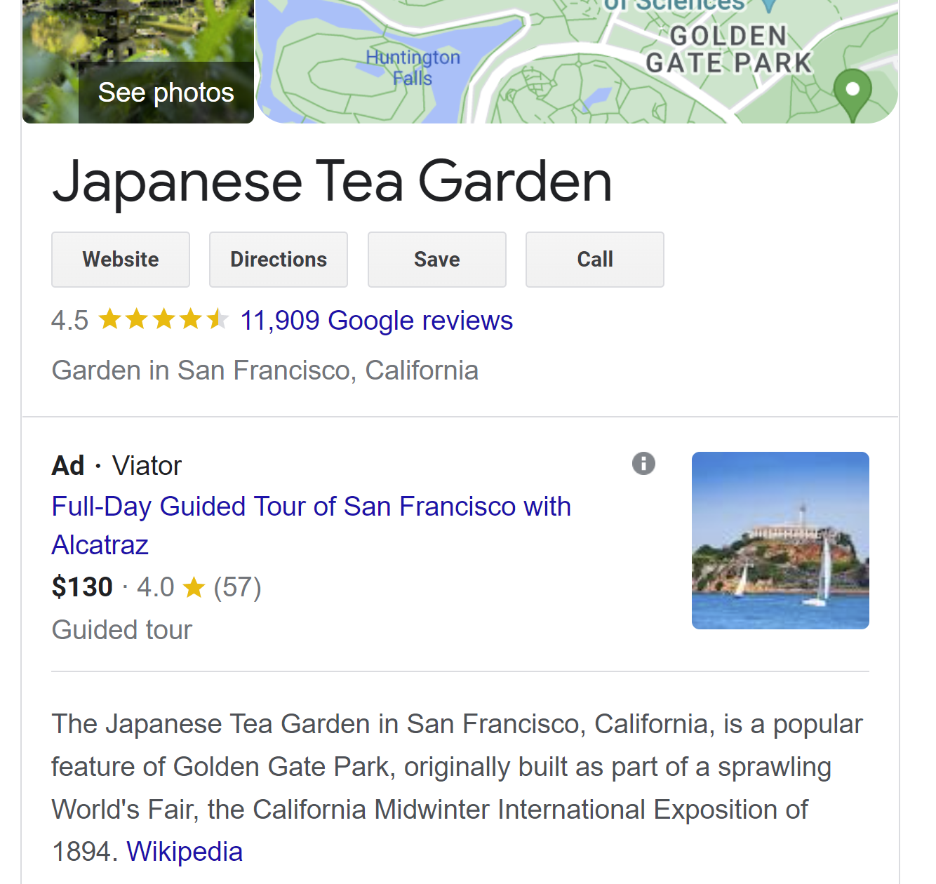 Some Google Business Profiles may included nearby experiences. This screenshot is also from the GBP of the Japanese Tea Garden in San Francisco, and is displaying other things to do in Golden Gate Park.