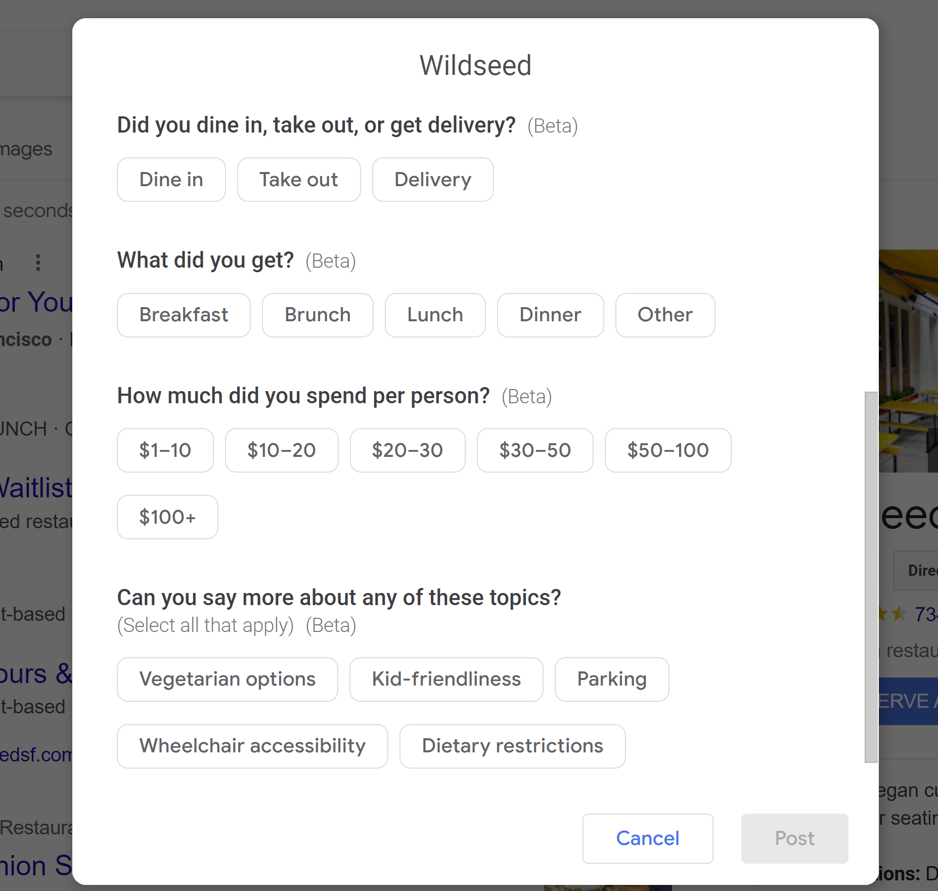 Unknown - Google asks reviewers to evaluate the prices they’ve paid at businesses, as seen above. There has been past debate over whether the prices published by local businesses on their digital menus influence these attributes, but Diamond Product Expert Ben Fisher has confirmed with Google that these elements stem entirely from UGC.