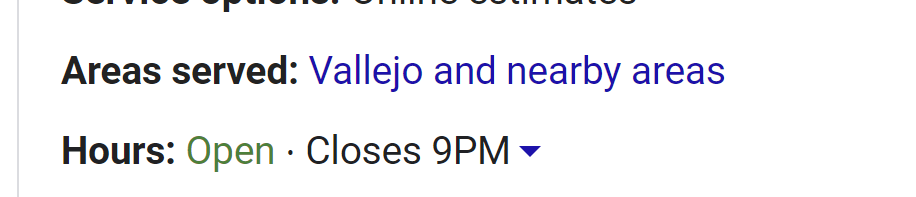 For brick-and-mortar businesses, this line must display a genuine, physical address that complies with Google’s extensive guidelines. For service area businesses that don’t serve customers at the company’s premises, Google wants the address to be hidden, and instead of showing a street address, an “area served” section like this will typically be shown:
