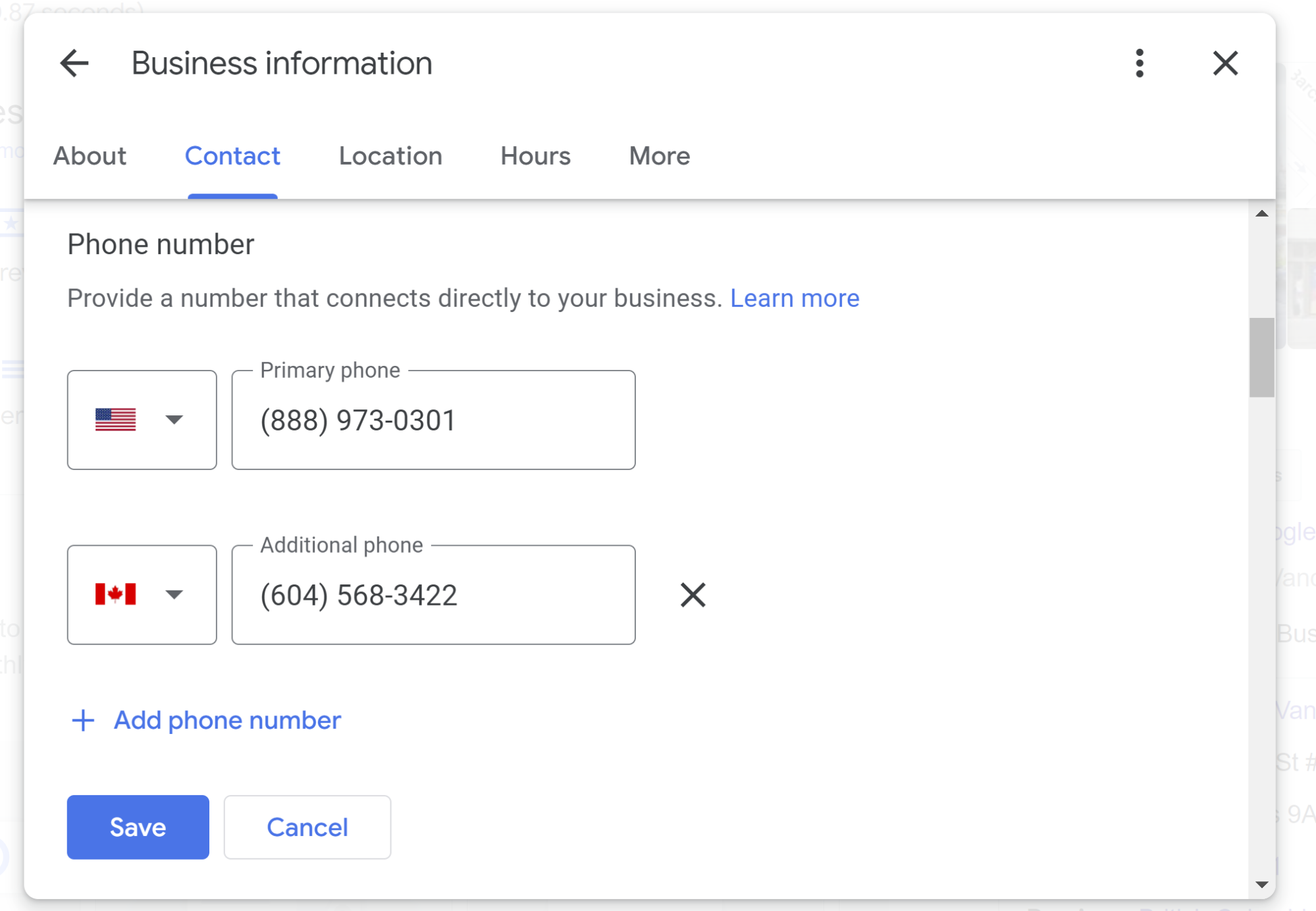 You can add a primary phone numbers and additional phone numbers to your listing. Google prefers that you use a local phone number rather than a call center helpline whenever possible, and they want your listed number to be in the direct control of your business. Your number can be either a landline or cell phone number, and it’s a best practice to be sure that whatever number you list is answered by staff who say the name of the business when they pick up. It’s not a good practice to have more than one business share the same phone number. For example, if you own both a Christmas tree farm and a woodworking studio on the same property and are listing each business separately, each business should have it’s own phone number. Premium-rate telephone numbers that charge callers high rates aren’t allowed.