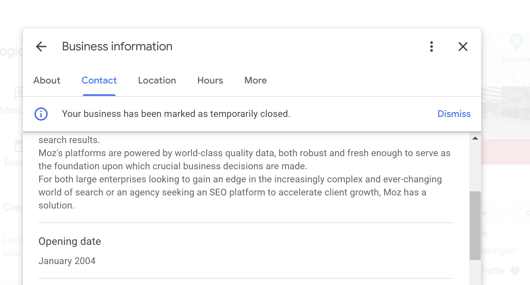 If your map pin is in the wrong place, click on the “Edit Profile” link in the new interface, then click the “Location” tab at the top of the “Business Information” pop-up, then click on the map.