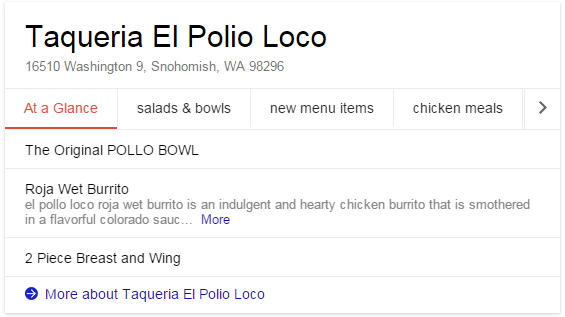 Restaurant menus for specific locations may be shown in a specialized, card-like format. These generally list the name of the restaurant, the address, and tabbed categories that allow you to scroll through a text-based menu.