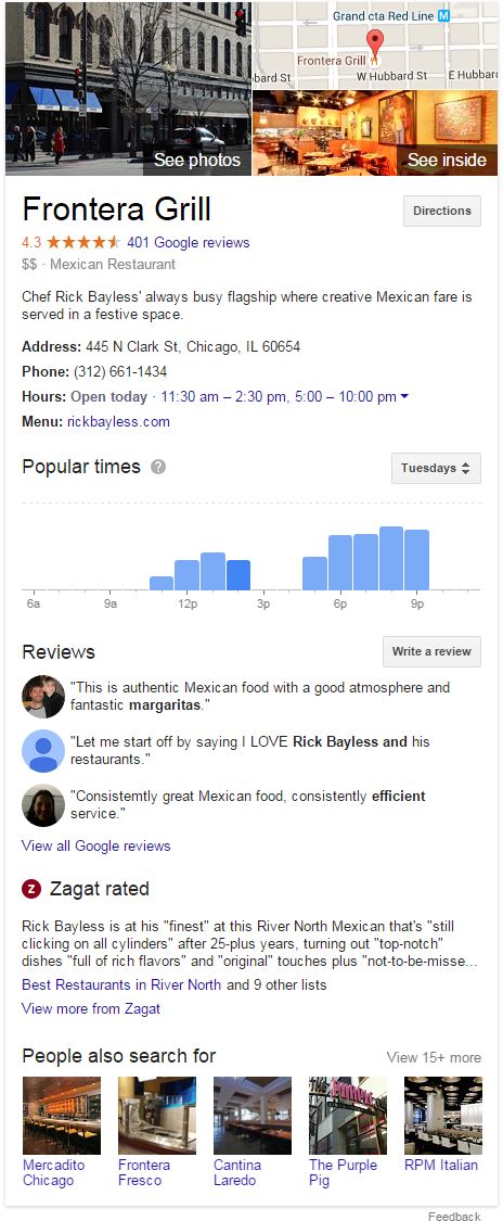 Often tied with Authoritative One-boxes, Local Knowledge Panels display rich information about a local business, including address, phone, hours, reviews, and, most recently, a graph of when you should expect a crowd.