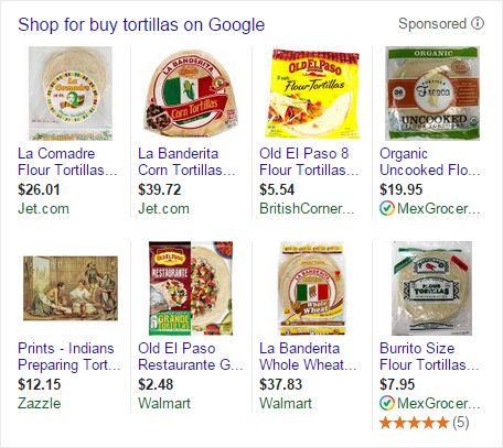 Paid Shopping results or Product Listing Ads (PLAs) sell products directly with rich information, such as images and pricing. Paid Shopping results in the left column usually appear as a horizontal row of products.