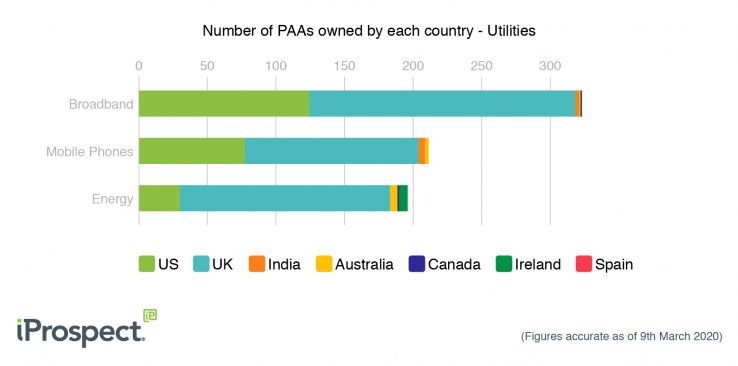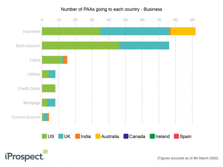 Breaking it down by category, we see that personal finance keywords bring back a UK PAA 33.72% of the time, insurance keywords 52.10%, utilities keywords 64.89%, and business keywords 38.76%.