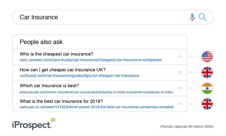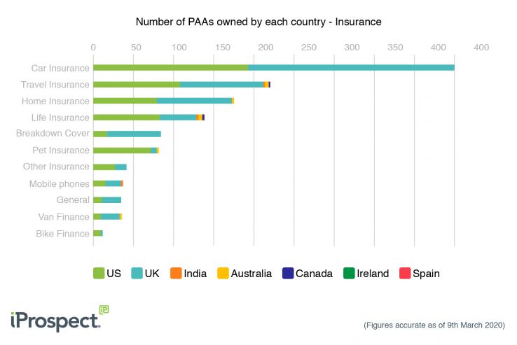 Out of the 350 insurance keywords tested, there were 64 keywords that didn’t bring back a single UK PAA result, including:
