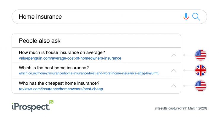 As one of the most competitive spaces in the finance sector, it was really surprising to see that only 56.25% of results for home insurance queries returned a UK PAA. There are nuances to policies across different markets, so this is a frustrating and potentially harmful experience for searchers.