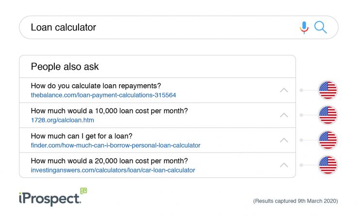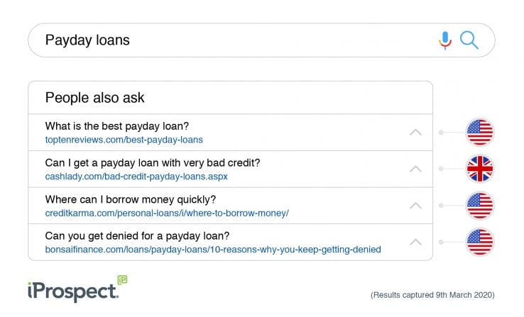 Only 15.8% of searches returned a UK PAA result with over 75% coming from the US. We also saw highly-competitive and scrutinized searches for keywords like “payday loans” generate several non-UK results.