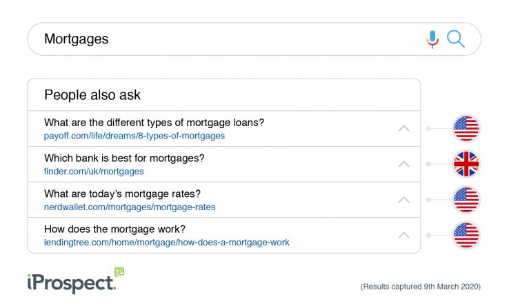 While the UK holds the majority of PAA results for mortgage-related keywords at 53.53%, there are still some major keywords (like “mortgages”) that only bring back a single UK result. If you’re searching for “mortgages” in the UK, then you want to see information about UK mortgages, but instead Google serves up mainly US results.