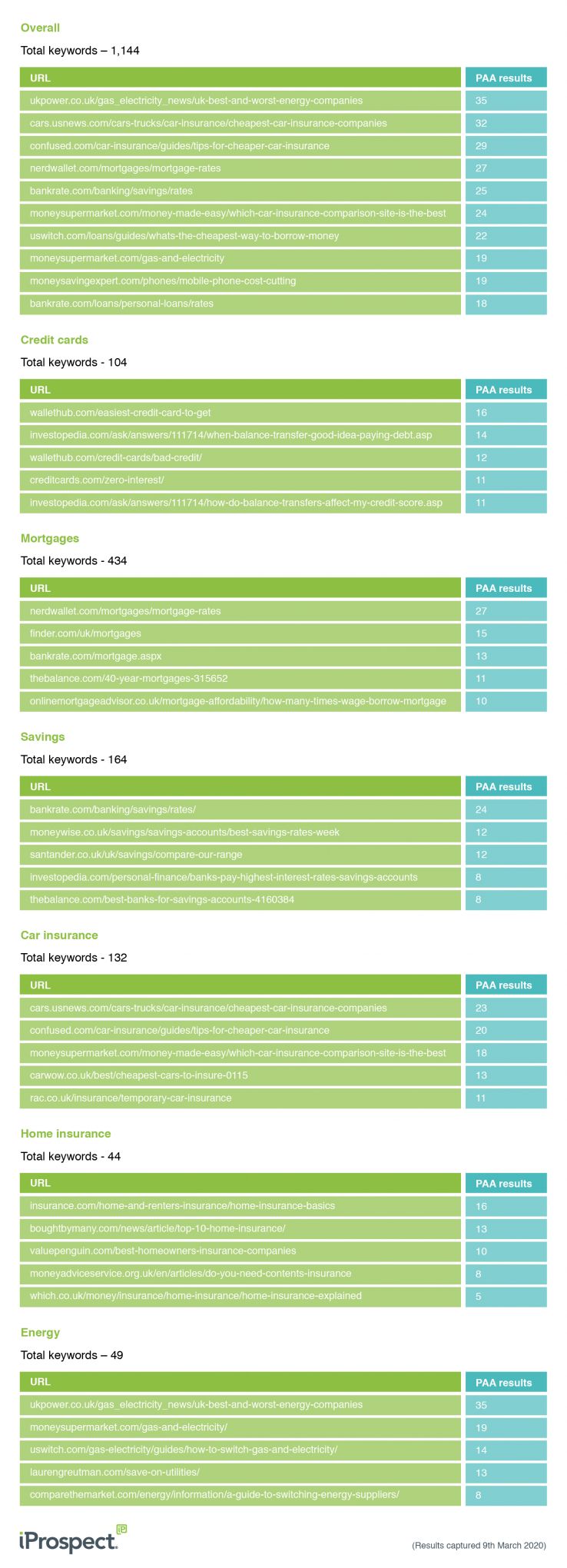 Ironically, four out of the top 10 were US-based (cars.news.com manages to generate 32 PAAs across one of the most competitive industries in UK financial searches: car insurance). A hat tip to ukpower.co.uk, which ranked #1 in our list, generating 35 results in the energy space.