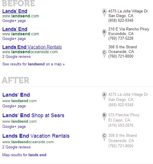 Here's a 3-pack of local results, for the query [lands end] and focused on San Diego, CA: