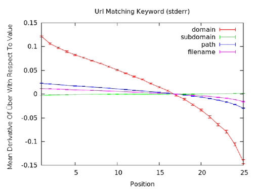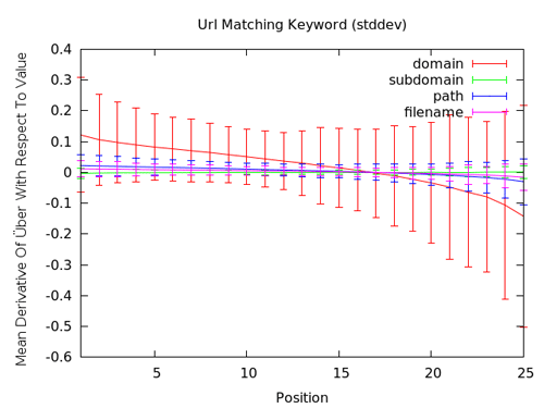 As you can see, this model suggests that, once again, subdomains are largely useless places to put keywords, but the root domain is a very good place to employ it. Path and filename are slightly positive, which also fits with our expectations. It's also important to note that on this chart some lines dip below 0 on the "mean derivative of uber" y-axis in the 20-25 ranking position range. This suggests that for those results, the keyword use may actually be hurting them. Looking into some sample results, we can see that a number of the URLs in that 20-25 range seem to be trying too hard. They're using the keyword multiple times in the domain/path/filename and fit with what many SEOs call "spammy-looking." It could certainly be a weakness in our model's accuracy, but we think it's also likely that a lot of pages would actually benefit from being a bit less aggressive with their URL keyword stuffing.