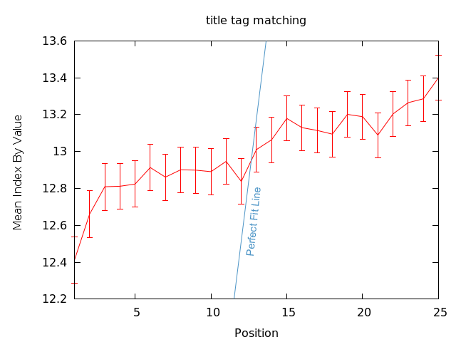 We've examined H1/H2/Hx tags in the past and come to the conclusion that they have little impact on rankings. This graph certainly suggests that's still the case. Employing the query in other on-page areas such as the body (anything between the <body> tags) and out anchors (employing the keyword in the <a> tag whether internal or external) have significantly greater correlation with rankings, while H1-H4 tag keyword use appears almost horizontal on the graph (suggesting no benefit is derived from its use). It's not as bad as the random effect we observed with meta keywords (the lines all start a tiny bit below 13 and end a tiny bit above), but the positive correlation is low and the horizontal is mostly inside the error bars.